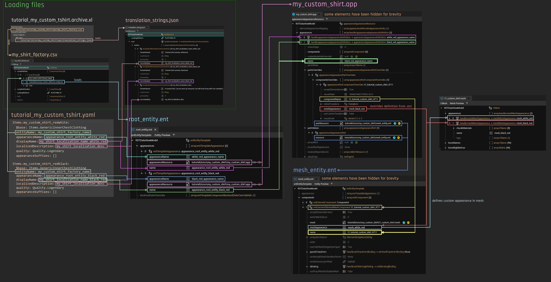appearance.app: Check thepartsValuesandpartsOverridesentries. They need to point at themesh_entity.ent, not at the mesh.mesh_entity.ent: Does thecomponententry point to a valid mesh? Try it with a default mesh as detailed above.
