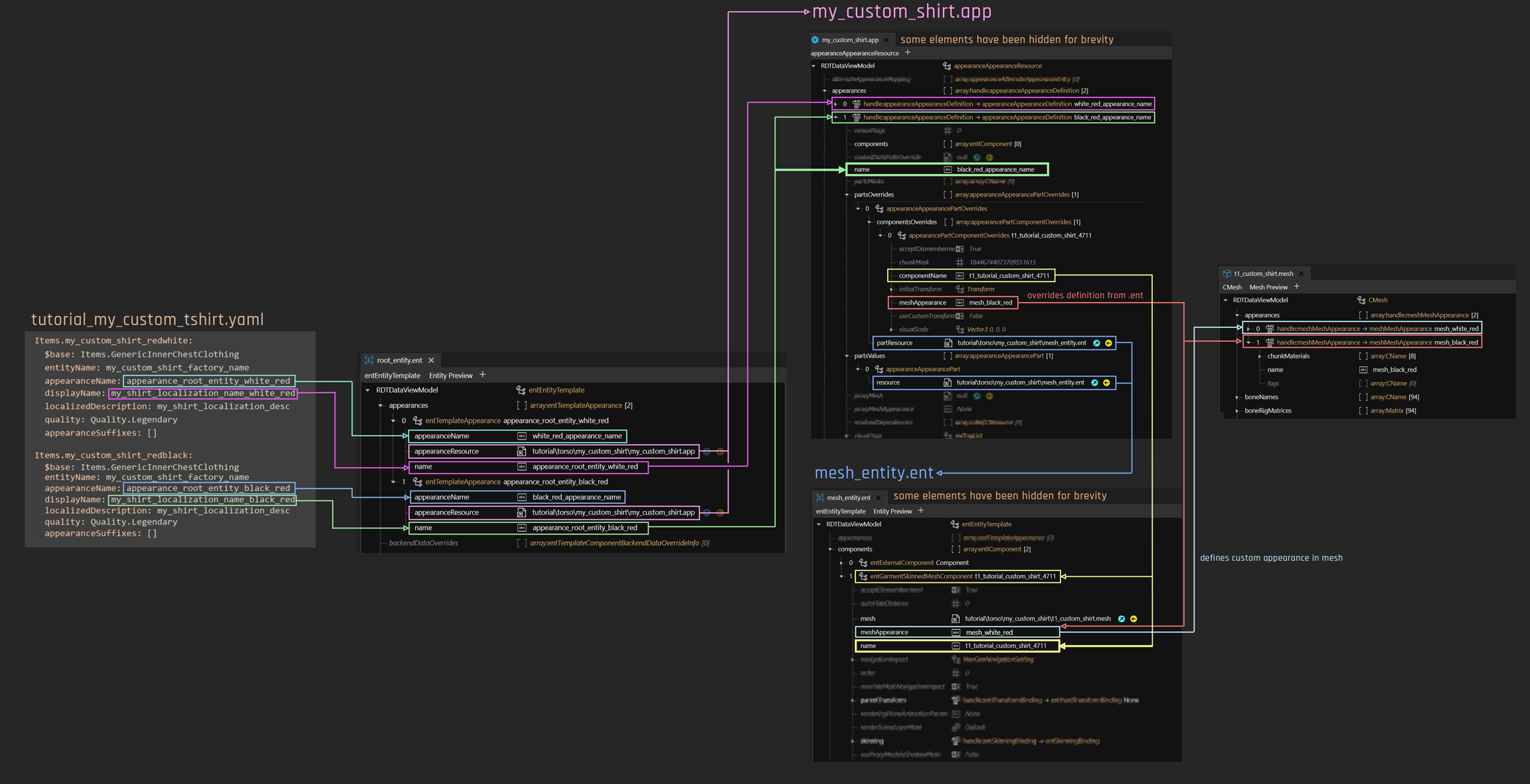 Contains a list of appearances as mapped by rootentity.ent. Each of the appearances will load mesh_entity.ent via partsValues and specify