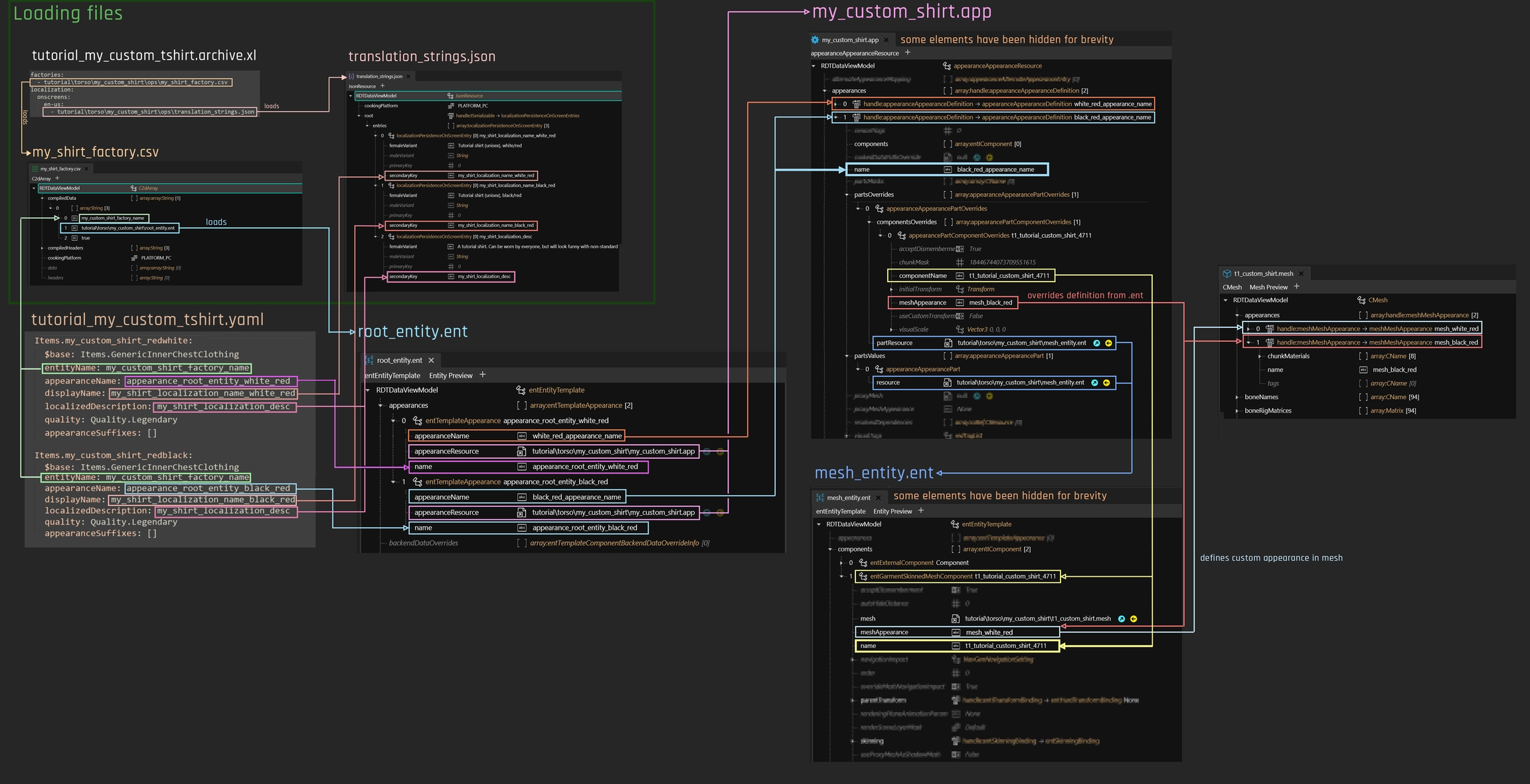 Contains a list of appearances as mapped by rootentity.ent. Each of the appearances will load mesh_entity.ent via partsValues and specify