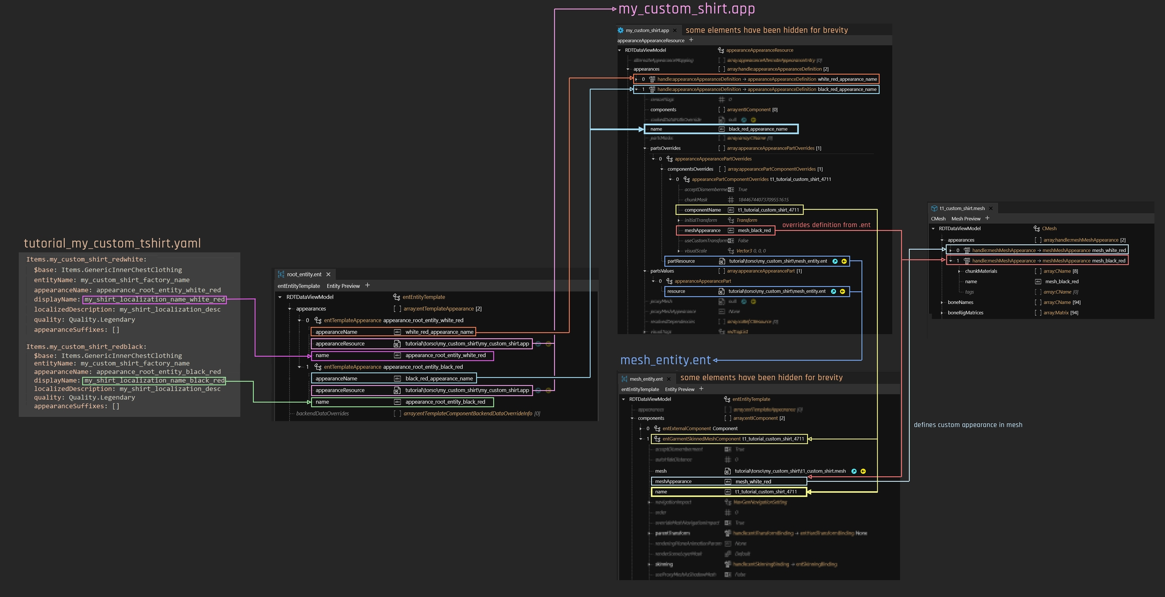 By bundling them in this file, we save ourselves a lot of copy-pasting inside the .app file. The only component we actually need to change is the one with "Mesh" in its name, typically entGarmentSkinnedMeshComponent: