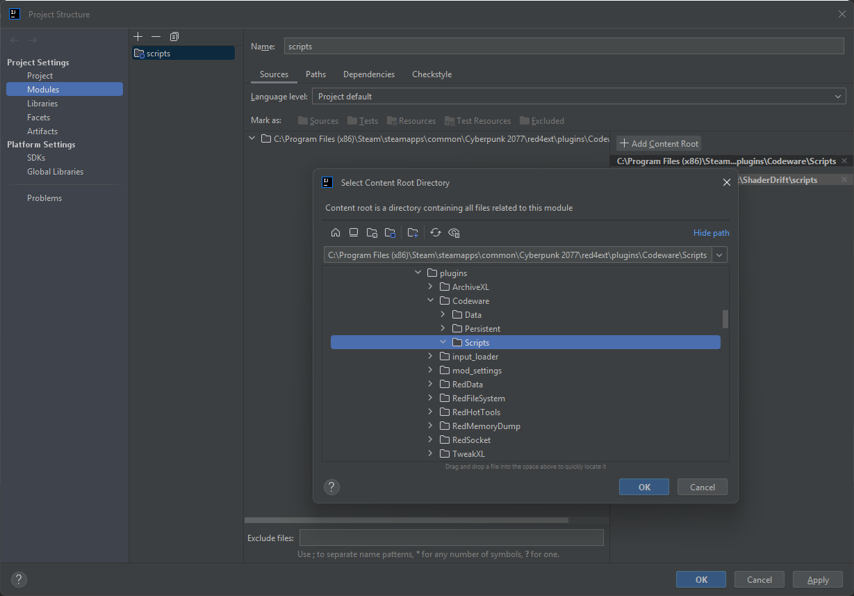Open **Project structure...** (CTRL + ALT + SHIFT + S). In **Project Settings** select **Modules**. Click on button **+ Add Content Root** to open a popup and select where Codeware's scripts are installed in your environment (e.g. `<game>\red4ext\plugins\Codeware\Scripts`):