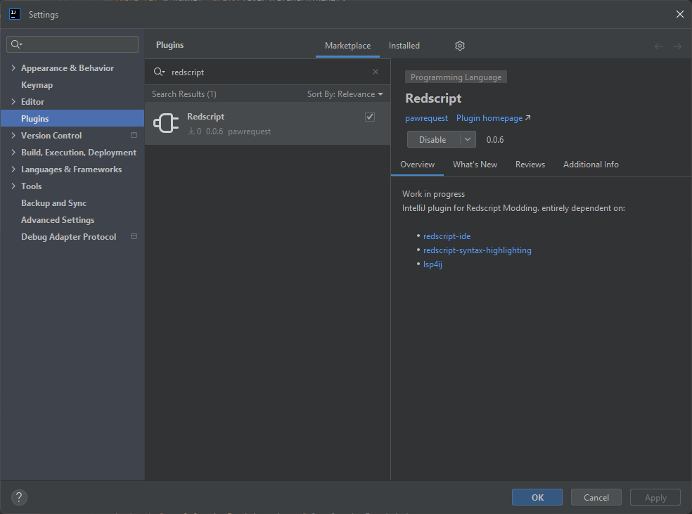 Open IntelliJ and create a blank project for now. Open **Settings** (CTRL + ALT + S) and select **Plugins**. In the **Marketplace** tab, search for `redscript`. It will show you the plugin made by pawrequest ([GitHub](https://github.com/pawrequest/redscript-intellij)). Select and install it. You'll need to restart IntelliJ to activate the plugin: