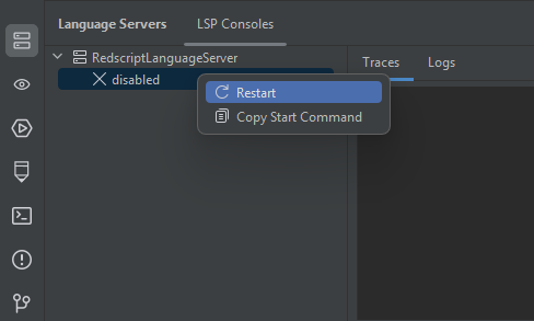In **Logs** tab, any errors related to Redscript Language Server will be visible here. These are not directly related to the JetBrains plugin. But they could provide useful information to help resolve an issue.
