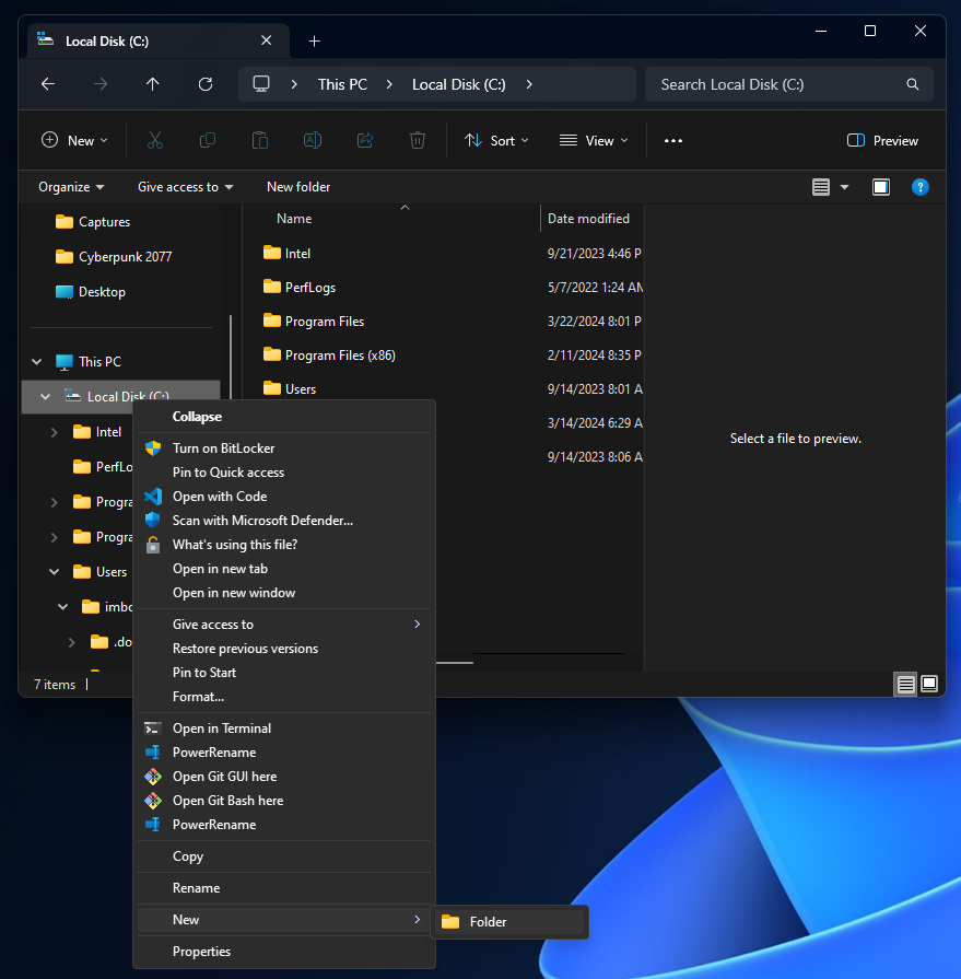 1. Right-clicking your C: drive, Click 'New Folder'\