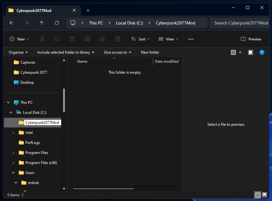 You can manually make your `Cyberpunk2077Mod` folder in the root of your C: drive by: