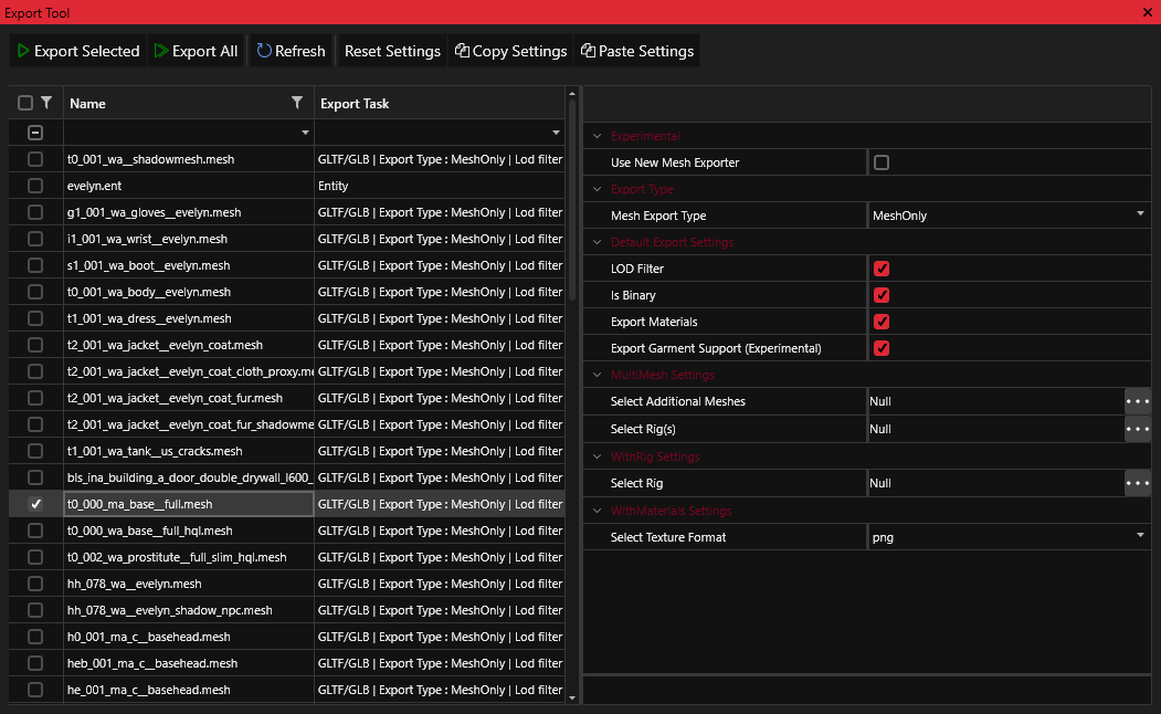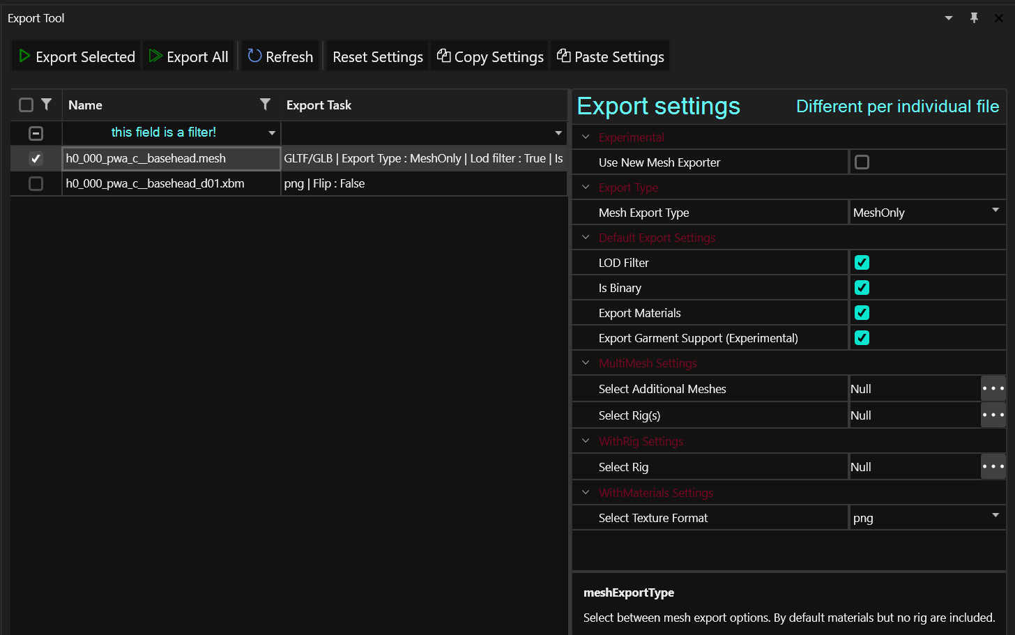 <table><thead><tr><th width="225">UI element</th><th>Explanation</th></tr></thead><tbody><tr><td>Export Selected</td><td>Exports anything you checked in the left-hand list</td></tr><tr><td>Export All</td><td>Exports all files in your project.<br><br>⚠ This button will always export everything, <strong>regardless of your filter</strong>.</td></tr><tr><td>Refresh</td><td>Refreshes the file list on the left</td></tr><tr><td>Reset Settings</td><td>Restores the Export Settings to default</td></tr><tr><td>Copy Settings</td><td>Copies the Export Settings of your currently selected file (<code>h0_000_pwa_c__basehead.mesh</code> in the screenshot above) so that you can paste them to other files.</td></tr><tr><td>Paste Settings</td><td><p>Pastes the Export Settings from the previous step to the currently active file. </p><p><em>This will not work if you copy/paste between incompatible file types.</em></p></td></tr></tbody></table>