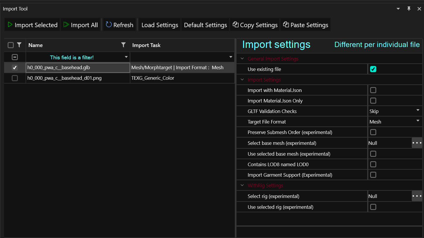 <table><thead><tr><th width="225">UI element</th><th>Explanation</th></tr></thead><tbody><tr><td>Import Selected</td><td>Imports anything you checked in the left-hand list</td></tr><tr><td>Import All</td><td>Imports all files in your project.<br><br>⚠ This button will always export everything, <strong>regardless of your filter</strong>.</td></tr><tr><td>Refresh</td><td>Refreshes the file list on the left</td></tr><tr><td>Reset Settings</td><td>Restores the Import Settings to default</td></tr><tr><td>Copy Settings</td><td>Copies the Import Settings of your currently selected file (<code>h0_000_pwa_c__basehead.glb</code> in the screenshot above) so that you can paste them to other files.</td></tr><tr><td>Paste Settings</td><td><p>Pastes the Import Settings from the previous step to the currently active file. </p><p><em>This will not work if you copy/paste between incompatible file types.</em></p></td></tr></tbody></table>